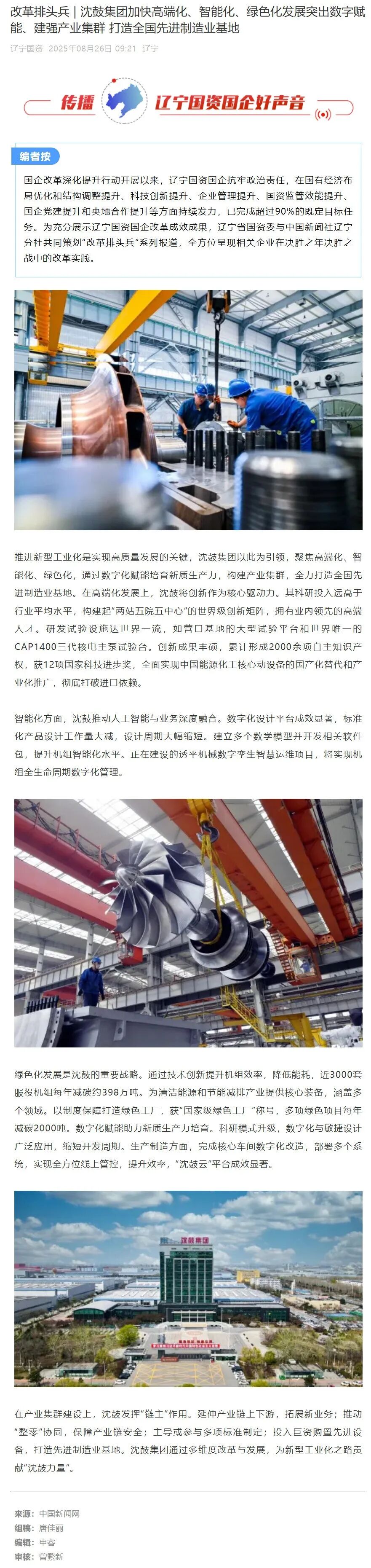 8月26日,中國新聞網發表題為《改革排頭兵|沈鼓集團加快高端化、智能化、綠色化發展》的報道。文章指出,沈鼓集團以推進新型工業化為引領,聚焦高端化、智能化、綠色化,不斷提升核心裝備的研發與制造能力,通過數字化賦能培育新質生產力。企業依托工業互聯網平臺,推動產業鏈協同創新,致力于構建高水平產業集群,為打造全國先進制造業基地提供有力支撐。