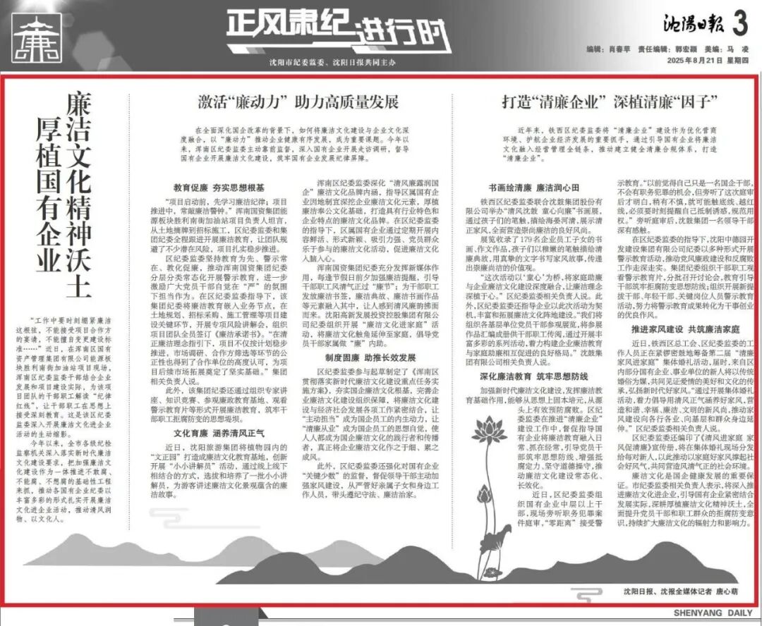 8月21日,《沈陽日報》報道了鐵西區紀委監委推動“清廉企業”建設的具體實踐。文中提到,鐵西區紀委監委聯合沈鼓集團股份有限公司舉辦“清風沈鼓 童心向廉”書畫展,通過孩子們的筆觸,描繪海晏河清,展示清正家風,全面營造崇尚廉潔的良好風尚。“清風沈鼓 童心向廉”書畫展活動,以“童心”為橋,將家庭助廉與企業廉潔文化建設深度融合,讓廉潔理念深植于心,著力構建企業廉潔教育與家庭助廉相互促進的良好格局。