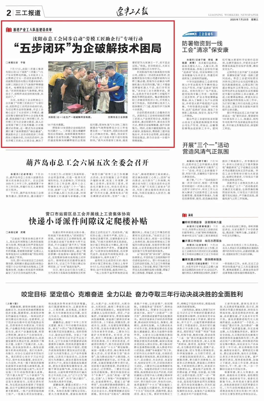 7月23日,《遼寧工人報》聚焦沈陽市總工會啟動“勞模工匠助企行”專項行動,報道了遼寧五一勞動獎章獲得者、沈鼓集團結構車間焊工劉躍臣,沈陽五一勞動獎章獲得者、沈鼓集團結構車間焊工甄必德,分別深入沈陽三洋重工集團有限公司、沈陽海為電力裝備股份有限公司,為兩家企業人員培訓指導焊接技術、突破技術難題,積極參與、助力市總工會精心設計的五步閉環工作模式,幫助企業排憂解難的先進事跡。