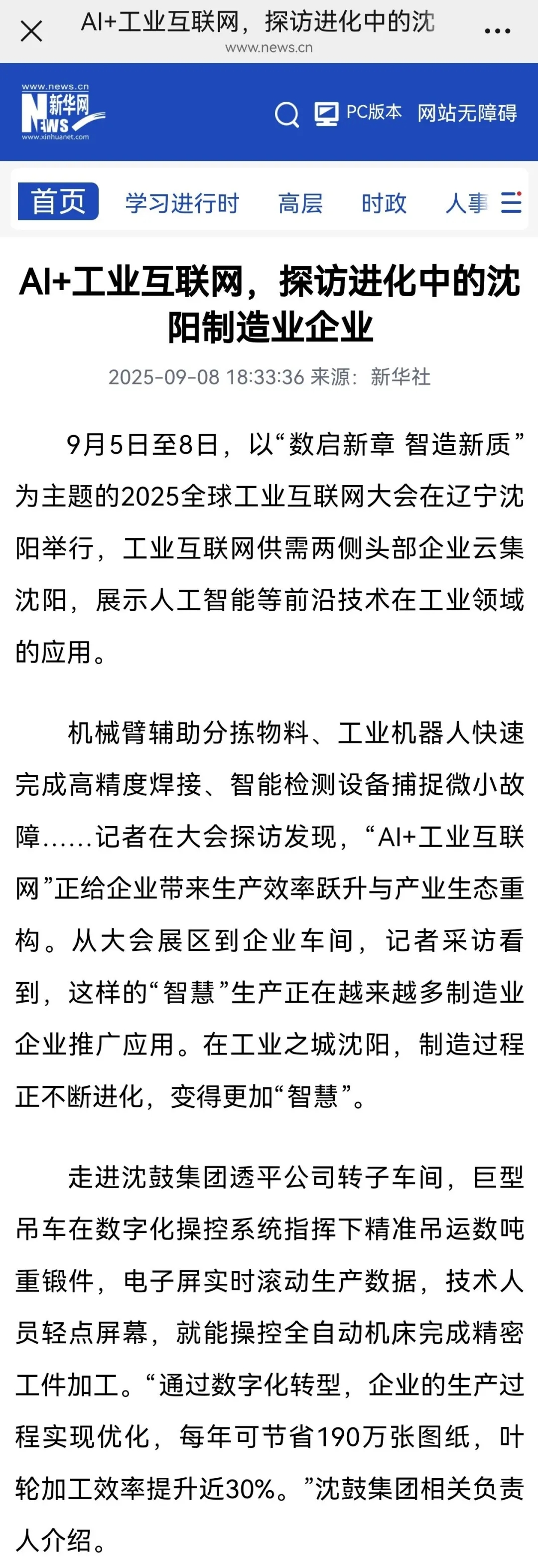 9月7日,沈陽廣電云盛京以《2025全球工業(yè)互聯(lián)網(wǎng)大會創(chuàng)新成果交流展,用“數(shù)”賦能,以“智”驅(qū)動,沈陽轉(zhuǎn)型路上加速前行!》為題,聚焦沈鼓在大會中的亮眼表現(xiàn)。報(bào)道指出,作為沈陽制造業(yè)數(shù)智轉(zhuǎn)型的標(biāo)桿,沈鼓在創(chuàng)新成果交流展中展現(xiàn)的“數(shù)智賦能”實(shí)踐,成為大會關(guān)注的焦點(diǎn)之一,其以工業(yè)互聯(lián)網(wǎng)技術(shù)推動企業(yè)轉(zhuǎn)型的路徑,為沈陽乃至東北老工業(yè)基地升級提供了生動樣本。