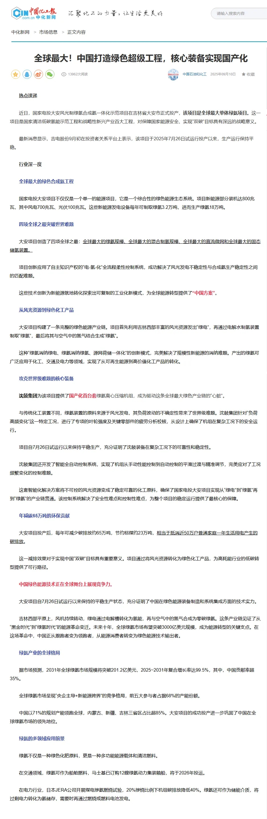 新浪財(cái)經(jīng)在《全球更大!中國打造綠色超級工程,核心裝備實(shí)現(xiàn)國產(chǎn)化》報(bào)道中,點(diǎn)贊沈鼓在“全球更大綠色超級工程”中的貢獻(xiàn)。沈鼓集團(tuán)為國家電投大安風(fēng)光制綠氫合成氨一體化示范項(xiàng)目提供了國產(chǎn)化首臺套綠氨離心壓縮機(jī)組,成為驅(qū)動這條全球更大綠色產(chǎn)業(yè)鏈的“心臟”。沈鼓集團(tuán)還為該項(xiàng)目開發(fā)了智能全自動控制系統(tǒng),實(shí)現(xiàn)了機(jī)組從手動性能控制到自動控制的平滑過渡與精準(zhǔn)調(diào)節(jié),完美應(yīng)對了工況頻繁變化的控制難題。沈鼓作為該項(xiàng)目的核心裝備供應(yīng)商,以自主研發(fā)的高端裝備打破國外壟斷,不僅保障了國家重大工程的自主可控,也彰顯了中國裝備制造的全球競爭力。